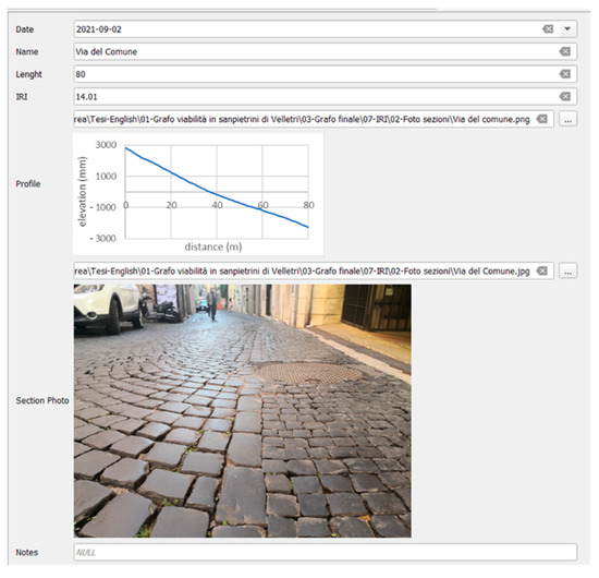 The measured longitudinal profiles are then processed to return the corresponding IRI values. Through the form in Figure 7, the results of the survey and subsequent processing are stored; specifically, the IRI values, the date, the profile detected by the profilometer, and an image of the pavement during the survey are stored.