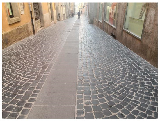 The field test was carried out in the city of Velletri, located in the southern district of Rome. The historic center is paved with Sampietrini pavements, consisting of polished black basalt blocks placed side by side in a regular pattern (Figure 10). The typical shape is cubic or a square-based truncated pyramid solid measuring 12 × 12 cm and 18 cm high.