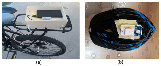 Figure 14. Installation of the prototypes on the bike: (a) Bike-frame and (b) Bike-helmet details.