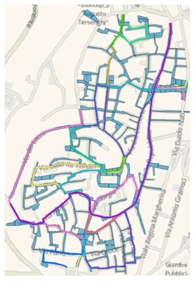 For the graph construction, we started with data from the 2014 regional technical map of the Italian Lazio region [70] provided in shape file format. However, the regional map identifies the streets without distinguishing between the different types of pavements, making it necessary to detect which streets in the city were paved with Sampietrini. This problem was overcome by using Street ViewTM [71] and some field visual inspections. GIS representation of Velletri’s Sampietrini network is shown in Figure 11.
