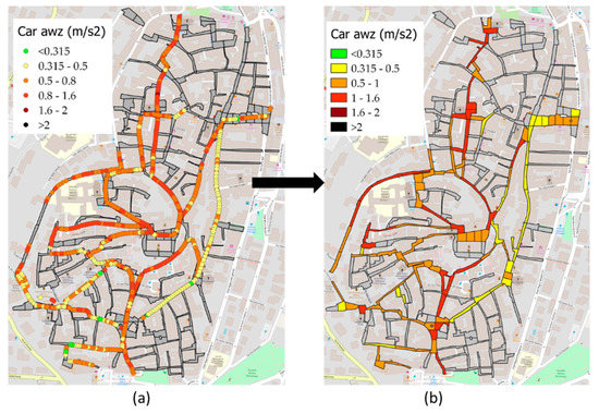 It should be noted that the sample unit lengths generally vary from 20 to 80 m, considering an average travel speed of about 5–6 m/s, within each SU fall between 3 and 16 awz measurements for each survey: for each SU, the awz value is returned by the average of the values. GIS tools manage spatial analysis algorithms, making it possible to associate points with sample units (areas). Therefore, it is possible to switch from the point representation of the awz values (Figure 9a) to the sample unit representation (Figure 9b). The rating scale adopted is provided by ISO 2631 [30].