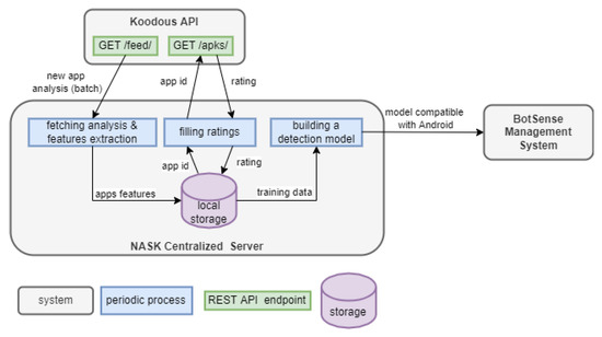Contrary to the above solutions, ever-growing big datasets of Android applications, both malicious and benign, with easy access via API, are available on Koodous (Koodous Documentation, https://docs.koodous.com, accessed on 20 July 2022) and Virustotal (https://virustotal.com, accessed on 20 July 2022). Koodous is a platform that has already collected over 70 million Android applications. Each application is available to download with both static and dynamic analysis performed with external tools (Cuckoo Sandbox (https://cuckoosandbox.org/, accessed on 20 July 2022), Androguard (https://github.com/androguard/androguard, accessed on 20 July 2022) and DroidBox (https://github.com/pjlantz/droidbox, accessed on 20 July 2022). The research community performs labelling applications based on the analysis results mentioned above. All data are available via REST API, with usage limits dependent on pricing plans. To our knowledge, the list of applications available in Virustotal and Koodous are similar, and both solutions are related. However, the advantage of the Koodous platform is the possibility to upload application samples to be analyzed by the community. This feature is highly important as the NASK National Response Team (https://www.nask.pl/pl/dzialalnosc/nauka-i-biznes/nask-incident-response/3985,NASK-Incident-Response-Team.html, accessed on 20 July 2022) monitors the local market to identify applications, especially dangerous for Polish users. Thus, in the rest of the paper, we present the results of the preliminary examination of the Koodous platform (commercial version) as the main data source for BotSense Mobile.