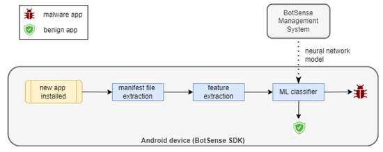 The decision to perform all analyses within the user device significantly influences the malware detection module—to assess application maliciousness, only data extractable within the device are available for analysis. Thus, approaches as API calls analyses [7,8], static code analyses [9,10] or dynamic code analyses [10] are not possible.