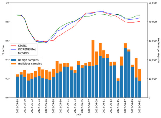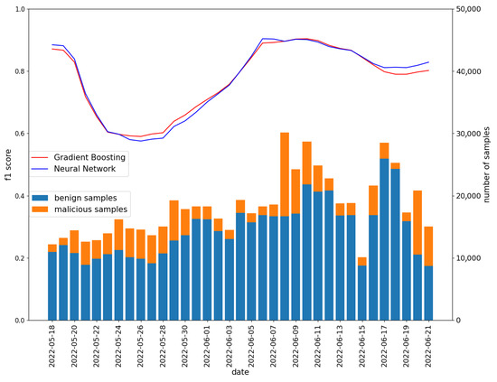 The aforementioned papers have some limitations according to the objectives presented in this work. First, in works [22,23,28], static analysis takes into account not only the manifest file but also API calls information. This information is not extractable within mobile devices due to Android safety mechanisms. Secondly, works [21,22,23,25,26,27] did not consider the date of application creation when splitting a dataset into training and testing datasets. Thus, the presented accuracy of the classifiers relates to the detection of known malware families, which is a significantly easier task. Consequently, the problem of model aging is not considered as well. Another issue relates to the requirement to transfer and run the classifier on the edge device. As we point out in Section 4.3, the most commercially mature solutions concern neural networks, which are used only in works [21,24,26,27,29]. Finally, all works were carried out on static, non-growing sets, which means that it is impossible to update models with the emergence of new malware families. One exception is works that only use the ever-expanding, up-to-date source of applications (e.g., Google Play Store or APKPure) in conjunction with some malware detection engine (e.g., VirusTotal) [21,23,29]. However, a strategy for updating the model over time has not been proposed and examined. Additionally, such an approach’s effectiveness would strictly depend on the quality of the applied malware detection engine. In this paper, the Koodous Platform is used as both a source of applications and a detection engine (community voting).