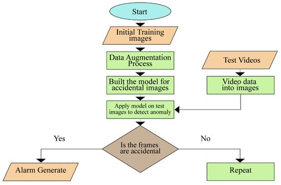 Flowchart of methodology. The first step is to initialize the training images. The second step is a data augmentation process. The third step is to build the model for accident images. The fourth step is applying the model to images. The fifth step is the detection of an anomaly in frames. The final step is to generate the alarm or repeat the algorithm.
