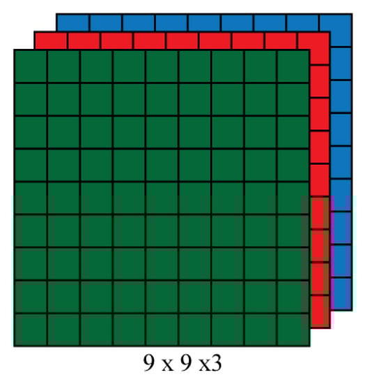 Array of an RGB matrix. Here, it is represented by nine columns, nine rows, and three channels.
