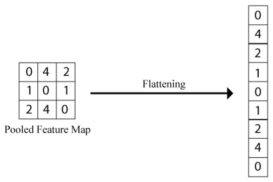 The matrix output by the pooling layer is first subjected to a flattening layer before forwarding the information to the neural network. The job of the flattening layer is to convert the matrix into an array of values with a width of 1. The purpose of this transformation is to make the input matrix compatible with the neural network, as the neural network is not able to process the matrix-like data and is only able to process a feature vector. A visual representation of this transformation is given in Figure 5.