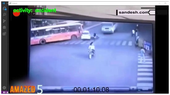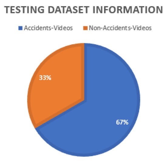 To find a dataset of traffic accidents, a detailed examination of commonly used video anomaly detection datasets was conducted, which included BOSS [], UMN [], avenue [], subway entrance [], subway exit [], UCSD Ped1 [], UCSO Ped2 [] and UCF []. The UCF dataset [] consists of long surveillance videos in which it tries to cover almost 13 types of real-world anomalies including arrest, assault, abuse, arson, shooting, fighting, burglary, accident, explosion, shoplifting, vandalism, and stealing. This dataset consists of 950 surveillance videos capturing different types of enlisted anomalies and 950 normal videos. The avenue dataset was provided and used by C. Lu [] and consists of 37 videos in which 16 were used for training and 21 were used for testing. The UMN dataset [] consists of five different videos in which abnormal behavior of people walking and running in the opposite direction was captured. The USD Ped1 dataset [] consists of a total of 70 surveillance videos, where 34 were used in the training phase and the other 36 videos were used for testing. This dataset also tries to capture the anomalous behavior of pedestrians. The USD Ped2 dataset [] contains 28 surveillance video clips that were also targeted to be used for studies regarding anomaly detection on busy streets. Normal events in this dataset are walking pedestrians, and abnormal events are bikers, wheelchairs, skaters, and joggers. The subway entrance dataset [] consists of a long video, with a duration of 1 h 36 min, capturing the movement of pedestrians going into the subway station. This dataset offers five types of anomalous events, i.e., loitering (IT), wrong direction walking (WD), irregular interactions among people (II), no payments (NP), and others. The subway exit dataset [] also consists of a 43-min-long video capturing people coming out of the subway station. The BOSS dataset [] is a set of surveillance videos captured by the camera in a train. It consists of 12 video clips. The interesting events for anomaly detection in this dataset are panic situations, harassment, and sick people. All these datasets are heavily in use in research in anomaly detection and are being used as a benchmark to compare the results produced by new techniques with previous techniques.