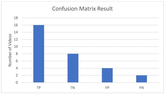 Here, the TP is the number of actual accident videos that were labeled as accidents, and the TN is the number of actual no accident videos that were correctly flagged as normal videos. FP is the number of actual accidents videos where the trained model was unable to detect the accident, and FN is the number of actual no-accident videos that are wrongly classified as accidents. The result of the confusion matrix is shown in Figure 19.