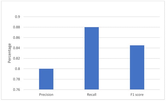 Figure 21 shows the precision of 0.8, recall of 0.88, and f1 score of almost 0.845 on the testing data, which implies a good performance of the trained model.