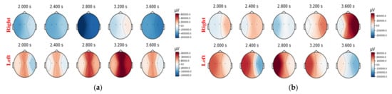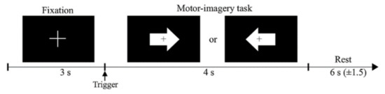 MI-BCI was tested with a dichotomous experiment in which subjects imagine their left and right hands in accordance with the directions of arrows, as shown in Figure 6. The EEG signals were recorded in two different sessions on different days. For all blocks of a session, black fixation was displayed on the screen for 3 s before each trial task began. The subjects then imagined they were performing the hand-grabbing action (grasping) in the direction specified by the visual cue. After the task, the screen display was blank for 6 s to allow the subjects to rest. There were 200 trials in one experiment per subject, half on the left and half on the right.