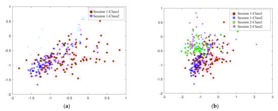 The feature distribution comparison of Subject 46. The features were extracted by a common spatial pattern (CSP). (a) The distribution of features for session 1; (b) The distribution comparison of features for Sessions 1 and 2.