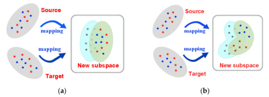 The goal of feature-based marginal distribution adaptation (MDA) methods is to have a common feature space in which the marginal distribution of the source domain and the target domain are as close as possible. Certain achievements have been made in the adaptation of marginal distribution in many fields including EEG signal processing with these methods. Liu et al. [9] applied transfer component analysis (TCA) in EEG-based cross-subject mental fatigue recognition. Zhang et al. [10] reduced distribution differences through an inter-domain scatter matrix based on cross-subject mental workload classification. Chai et al. [11] proposed the use of subspace alignment (SA) to transform features into a domain-invariant subspace to solve the adaptation problem of EEG-based emotion recognition. He et al. [12] applied correlation alignment (CORAL) to minimize the spatial offset when solving the problem of different set domain adaptation for BCIs. Hua et al. [13] applied geodesic flow kernel (GFK) in EEG-based cross-subject emotion recognition. With the development of transfer learning, new progress has also been made in MDA. Wei et al. [14] applied the linear weighting method to the four frequently adopted DA methods (TCA, manifold alignment, CORAL, and SA) to determine coefficients through repeated iterations using the principle of neighborhood consistency. Ma et al. [15] identified the center particle position between the two domains and aligned the center position of the source domain and the target domain by translation. A common problem of these approaches is that although they reduce the marginal distribution differences between the source domain and the target domain in the new subspace, the data categories remain indistinguishable, as displayed in Figure 3a. Considering the difficulties in classifying the features extracted by the MI-BCI illiterate subjects, the above works were probably not optimal for BCI illiteracy. We need to find a new subspace in which the divisibility of categories is maximized and the difference between domains is minimized, as displayed in Figure 3b.