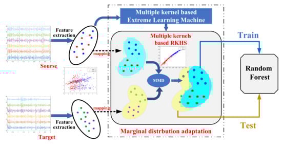 Our proposed distribution adaptation and classification framework based on multi-kernel learning is displayed in Figure 4. The extracted features of the EEG-based BCI system used for the training classifier were defined as source domain features, and the features used for testing were defined as target domain features. The source domain features were used to train the multiple-kernel ELM and the weights were then determined. Next, the kernel function that allows for the maximal inter-class divisibility after the data are mapped to the new RKHS is obtained. Then, the features of the source domain and the target domain were aligned based on MK-MMD under the new RKHS. Then, we applied the adapted training features to train the RF to obtain a suitable classifier.