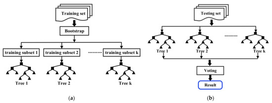 Random forest [36] is a type of ensemble learning, which is to combine several base classifiers to obtain a strong classifier with significantly superior classification performance. The principle of random forest is to obtain the final classification result by voting. The generation process of random forest is shown in Figure 5.