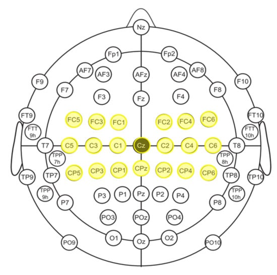 To retain the EEG information of the subjects as much as possible, as shown in Figure 7, 20-channel EEG data of the motor cortex region were selected: {FC5, FC3, FC1, FC2, FC4, FC6, C5, C3, C1, Cz, C2, C4, C6, CP5, CP3, CP1, CPz, CP2, CP4, CP6}. The EEG signals were downsampled to 100 Hz, and the 5th order Butterworth digital filter was utilized to obtain 8–30 Hz signals. Then, the range of 500–3500 s after the task started was selected. A common spatial pattern (CSP) was applied to maximize the difference between the two types of tasks. The first five dimensions of the feature vector were selected, and after that, the log-variance feature was calculated. Therefore, the CSP feature of a single trial was 1 × 10.