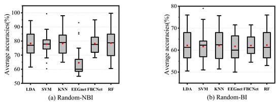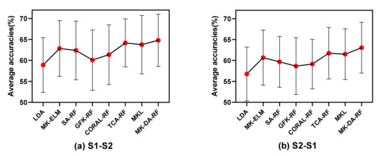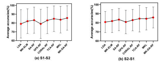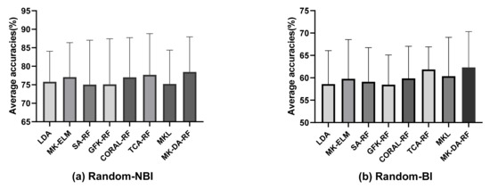 We randomly selected one subject as the subject of the training field and another subject in the same session as the target domain based on two methods, namely, the first subject was selected from those whose target domain was specified as the NBI group, and the second subject was selected from those whose target domain was specified as the BI group. When applying the proposed MK-ELM for classification, compared with LDA as the reference method, the average classification accuracies were improved, among which the biggest gain was 1.26% and 1.18%, respectively, which proved that the MK-ELM adopted in this paper increased the data divisibility in the new RKHS. Then, the competitive marginal distribution method was applied to the feature distribution adaptation. As can be seen from Figure 8, the classification accuracies of MK-DA-RF improved by 2.65% and 3.72%, respectively, compared with LDA as the reference method and by 0.78% and 0.46% compared with TCA-RF, which was the best-performing control method.