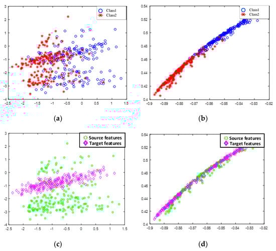 The feature distribution of the same subject before and after MDA was observed, and the first two dimensions of the feature value were taken as the X-axis and Y-axis, respectively, to check the feature distribution. Figure 11 shows the original feature distribution of Subject 19 and the feature distribution obtained with the method proposed in this study. Specifically, Figure 11a,b is the feature space distribution of class 1 (left-hand motor imagery) and class 2 (right-hand motor imagery), respectively. It can be seen that the class divisibility of the feature distribution was increased with MK-DA. Figure 11c,d refers to the feature distribution before and after MK-DA was employed. It can be seen that the feature space of the source domain and the target domain were further closer by the method proposed in this paper.