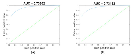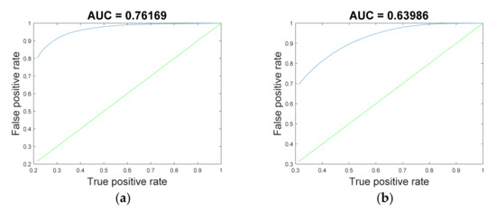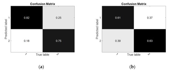 In the cross-subject experiment, as shown in Figure 12, RF achieved relatively better results in all experiments. The classification accuracies of the proposed RF improved by 0.17% and 0.17%, respectively, compared with LDA, which was the best-performing control method. The results of the performance evaluation metrics are shown in Table 5. The confusion matrices and receiver operating characteristic curves are shown in Figure 13 and Figure 14.