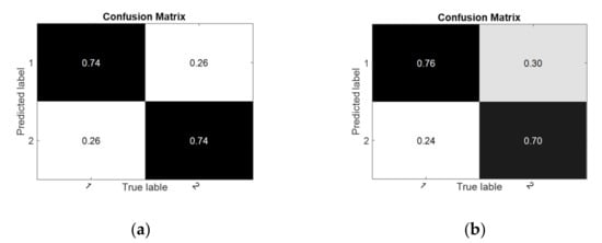 The confusion matrices of RF in the cross-session experiment. (a) S1-S2; (b) S2-S1.