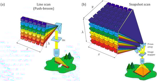 Portions of the data cube collected during a single detector integration period for (a) push-broom: spatial dimension (y-line), spectral dimension (λ) and (b) snapshot devices: spatial dimension (x, y), spectral dimension (λ) (adapted from Jurado et al. []).