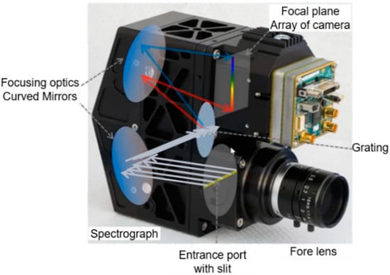 Nano-Hyperspec is a push-broom sensor, which means that it acquires radiometric information corresponding to each spatial line in the scanned range. When the light enters through the lens, the optics inside the sensor disperse the light in the spectral axis, acting similar to 640 spectrometers—size of CCD line. After entering through the lens, the light is blocked at the optical system’s entrance port. The part corresponding to a small slit is let in, ensuring that only the rays corresponding to the strip of the observed terrain will enter. This spectrograph is based on offner spectrometers that have been most widely developed for hyperspectral imaging because they have better image quality and spectral resolution than other types of spectrometers []. The optical system included in the Nano-Hyperspectral sensor is shown in Figure 4.