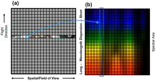 Operation principle (viewed through the slit): (a) spatial information collected, corresponding to the area scanned by the sensor—light passing the slit; (b) light passing the slit is dispersed on 272 bands, from the short to the long wavelength. Adapted from Headwall Photonics, Inc.