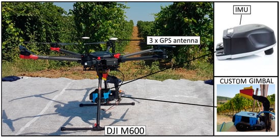 The DJI Matrice 600 (M600) Pro hexacopter was the flight platform coupled to Headwall’s Nano-Hyperspec sensor. To assure sensor’s stability, a Ronin-MX gimbal was mounted in the M600. A 12 mm lens with a horizontal field of view (FOV) of 21.1° was used. Each line of pixels comprises 640 spatial pixels and 272 spectral bands with a total of 172,800 pixels-waveband combinations. The sensor acquires 12-bit data, i.e., 4096 brightness levels across the visible and near-infrared spectrum, ranging from 400 to 1000 nm, with a sampling interval of 2.2 nm and a full width at half maximum (FWHM) of approximately 6 nm []. Five Global Positioning System (GPS) antennas are mounted on the M600 upper plate and opposite arms: three for the UAV’s navigation and altitude determination and two, mounted in the arms, used in the positioning of the hyperspectral sensor. An inertial measurement unit (IMU) is also used to account for the effects of roll, pitch, and yaw. With this equipment profile, the M600 has a flight autonomy of approximately 20 min. More sensor specifications are presented in Table 2 and the aforementioned components are depicted in Figure 3.