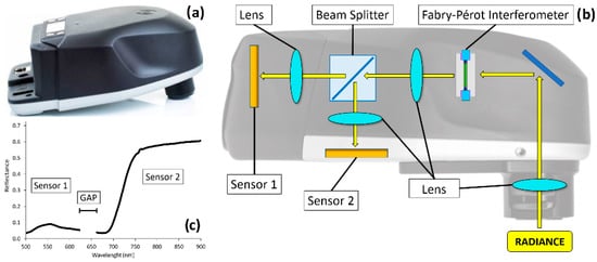 Senop Hyperspectral sensor HSC-2 (a) with details of the optic system based on Fabry-Pérot Interferometer (FPI) technology, a beam splitter and two CMOS sensors (b). The graph (c) shows a reflectance vegetation signature composed by the two sensors, and the “gap-area” placed between them (@ 636 nm) with invalid data.