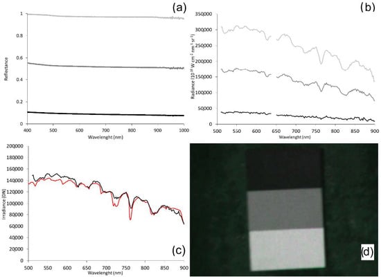 (a) Reflectance spectral signature from 400 nm to 1000 nm of the control targets (OptoPolymer panels) obtained in the field with the spectroradiometer (GER); (b) Radiance spectral signature of the control targets (OptoPolymer panels) obtained in the field with Senop HSC-2; (c) Irradiance spectral signature (DN) comparison between GER spectroradiometer (red line) and Senop HSC-2 (black line); (d) OptoPolymer reference panels in the field. Reference panels legend: white panel @ 97% reflectance (light grey line), grey panel 56% reflectance (dark grey line), black panel @ 10% reflectance (black line).