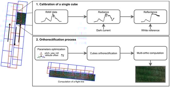 Nano-Hyperspec processing workflow is shown in Figure 10 as implemented in Headwall’s Spectral View software (Headwall Photonics, Inc., Bolton, MA, USA). As it can be seen, raw cubes’ calibration is the first required step (section 1 of Figure 10). Sensor’s measurements are converted into radiance using measurements at the ground (dark current). Next, the reference target measurements are used to convert radiance into reflectance. This normalization allows easier data manipulation because values are within the 0 to 1 range (0% to 100%) and are consistent, regardless of the lighting conditions when data was acquired. The next step consists in the orthorectification process (section 2 of Figure 10), where individual cubes taken over an area during a single scan (flight) are combined. Usually, several scanlines are associated into frames (images or individual hyperspectral cubes) that will be stitched together, creating a hyperspectral swath. As mentioned in Section 2.1.1, scanline sensors are highly sensitive to motion and therefore a stabilized gimbal and an IMU are used. Every pitch, roll and yaw change automatically carried out to follow the pre-programmed flight plan is transcribed into the acquired data. For a given cube, several parameters are required to be set. Therefore, this is an iterative process, where a fit of orthorectified cubes is analyzed over Google Earth maps. Parameters need to be adjusted until a satisfactory result is achieved, namely pitch, yaw, roll and altitude offset. The latter is of crucial importance since it is related to the surveyed terrain altitude and may influence the orthorectification process. Thus, the suggestion is to start by optimizing this parameter over a cube where visible reference points—acting as ground control points (GCPs)—can be determined. The remainder parameters are then adjusted according to the acquired fit. A good strategy is to consider the elevation profile of the scanned area. Indeed, an area with no significant changes in altitude enables the setting of parameters for multiple cubes simultaneously (batch process), which can save a significant amount of processing time. However, the direction from where the cubes are captured needs to be considered, because for each direction the parameters act differently. For this reason, only interleaved strips can be considered to apply the same parameters. Furthermore, the Digital Elevation Model (DEM) of the scanned area plays an essential role in the orthorectification process. Thus, low-resolution DEM (e.g., Shuttle Radar Topography Mission—SRTM) that cannot capture the terrain diversity will acquire insufficient results for those areas. To prove DEM’s influence in the orthorectification process, three flight campaigns were conducted: a campaign over two steep slope areas with different flight orientations and a flat coastal area, which are detailed in Section 2.4.