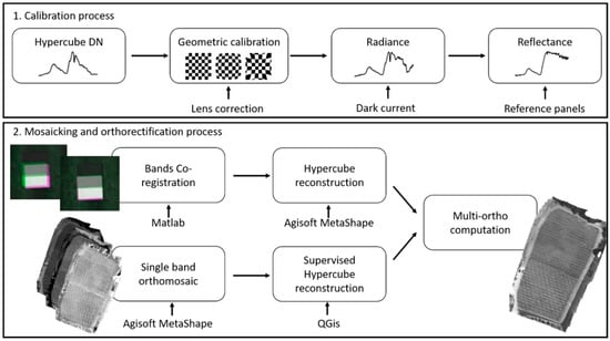 The processing workflow method can be summarized as presented in Figure 11. Matlab was used to process the hypercube acquired by the HSC-2 sensor and for dark current subtraction, radiometric calibration, mosaic filtering, index calculation and to produce the classified map as the final product. Agisoft Metashape (AgiSoft LLC, St. Petersburg, Russia) was used for lens correction and single bands mosaicking. Finally, QGIS was used for multi-bands matching.