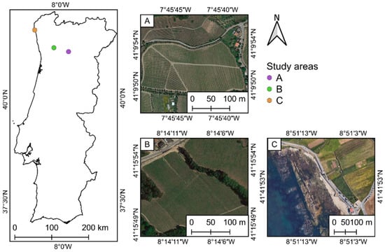 Location of the Portuguese study areas: (A) 1.5 ha vineyard parcel, belonging to Quinta do Vallado, Peso da Régua, Portugal; (B) 2 ha vineyard parcel, in Lousada, Porto, Portugal; and (C) 5 ha coastal area, located in Viana do Castelo, Portugal. Images from Google Earth (accessed on 18 December 2020).