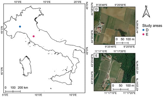 Location of the Italian study areas: (D) 1 ha Piacenza vineyard parcel—215 m ASL—belonging to Tenuta La Pernice, Borgonovo Val Tidone, Piacenza, Italy; and (E) 1.2 ha Chianti vineyard parcel—355 m ASL—in the Castello di Fonterutoli farm, Castellina in Chianti, Siena, Italy. Images from Google Earth (accessed on 18 December 2020).