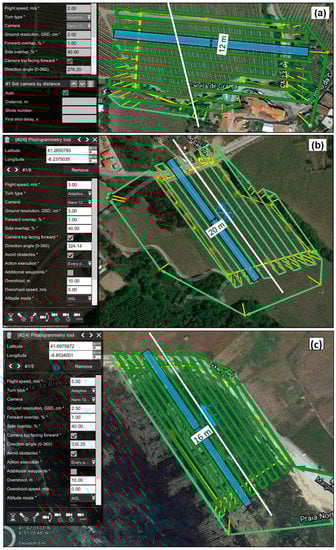 Flight plans, parameters and mission area for the Portuguese study areas: (a) Vallado; (b) Lousada; and (c) Viana. The white dashed lines represent the elevation profile lines.