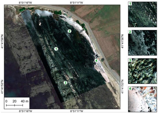 To verify the relief/altitude effect in the orthorectified mosaics generated from the acquired hyperspectral swaths, a sea level test area was added to the study. For this purpose, a 5 ha coastal area (Figure 13C), located in Viana do Castelo, Portugal, was considered.