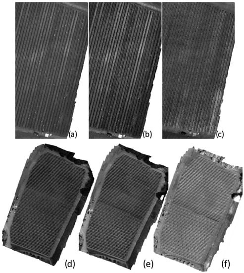 Overview of the single band mosaics (a–d) band 520 nm; (b–e) band 600 nm and (c–f) band 810 nm, for both Piacenza and Chianti study areas, respectively. Map details related to scale and geographic coordinates are reported in Figure 14.