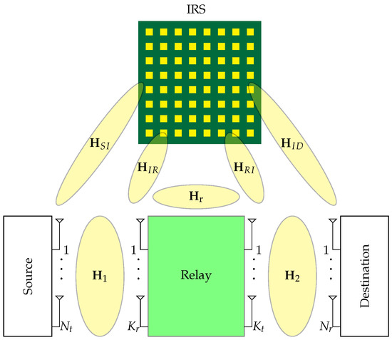 where is the channel from the source to the IRS. Finally, IRS can be used to help the channel from the relay to the destination. In this case, the received signals are going to be