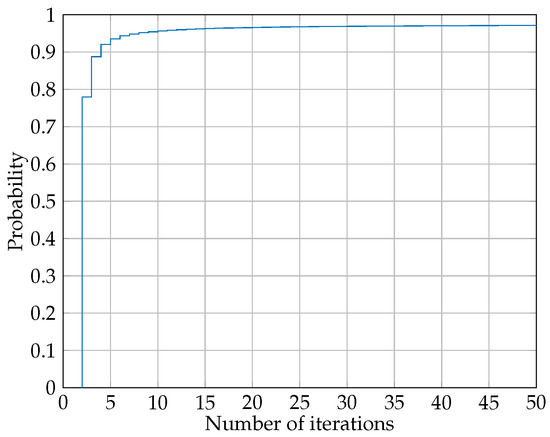 Cumulative distribution function (cdf) of iterations when and and . The maximum number of iterations is set to be 50. Cases that took more than 50 iterations to converge are considered to be divergent.