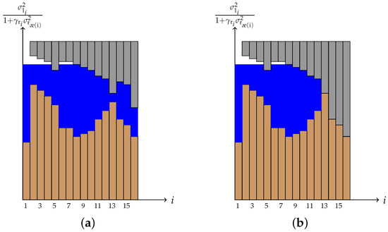 Examples of multilevel water-filling for two different cases. (a) No subchannel with optimum power equal to zero. Note that due to the power cap constraint (37d), water does not have the same level for all subchannels. (b) Subchannel receives the optimum of zero as its input power. Notice that in this case, due to the additional power cap constraint (37d), all the remaining subchannels also have zero power.