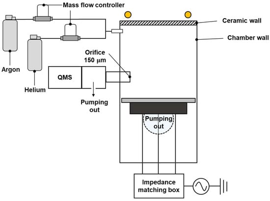 A schematic outline of the vacuum chamber is shown in Figure 1. Two mass flow controllers (LineTech Inc., Daejeon, Korea) injected 99.999% purity Ar and He gas at a maximum flow rate of 50 standard cubic centimeters per minute (sccm). The chamber was pumped out by a 99-L-per-min (L/min) rotary pump (Varian, Crawley, UK) that was connected to the center of the chamber body. The base pressure of the chamber was 5.3 Pascal (Pa), which was read by a Baratron gauge (MKS, Andover, MA, USA).