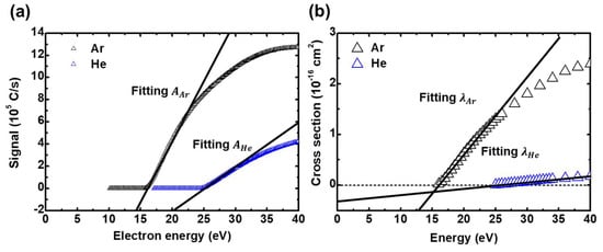 where  is the QMS signal intensity,  is the extraction efficiency of the ions from the ionizer,  is the transmission efficiency of the quadrupole mass filter (which is a function of the ratio of mass to charge),  is the detection coefficient of the channeltron detector,  is the ionizer length,  is the electron current in the ionizer,  is the cross-section of ionization, and  is the density of neutrals in the ionizer. As Equation (2) shows, neutrals can be detected in the QMS when becoming ions. Figure 2a shows the measured QMS signal of Ar at 10.13 Pa chamber pressure and He at 31.6 Pa chamber pressure, and Figure 2b shows the Ar and He direct ionization cross-section []. The signals are obtained by sweeping the electron energy of the ionizer from 10 eV to 40 eV. Referring to the cross-section, Ar becomes Ar+ after the electron energy exceeds 15.8 eV, and He becomes He+ after the electron energy exceeds 24.7 eV. Therefore, the signals appear after the electron energies increase above each threshold energy of neutral ionization. The signal curves up near the threshold energy, and after that, it linearly increases with electron energy. When the electron energy is higher than the threshold energy by 5–10 eV, the increase rate of the signal slightly declines. These signals are used for calculating the density via APMS.