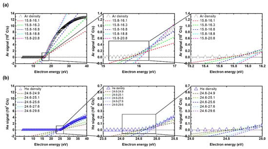 Here,  and , which are suggested by Singh, should be calculated near the threshold energy. However, since QMS signals are not linear right above the threshold, the linear fitting results can differ significantly according to their fitting ranges. Figure 3a,b show different fitting lines with different fitting ranges of Ar and He, respectively. Each fitting range was determined to be from the threshold energy to some energy higher than the threshold by an arbitrarily chosen amount. The fitting ranges and resulting slopes obtained from the Ar and He signals are listed in Table 1. Ranges 1–5 correspond to fitting ranges of 0.3, 0.5, 1, 3, and 5, respectively. In Figure 3, it can readily be seen that the different fitting ranges cause various slopes of the fitting lines, leading to inaccurate density calculations. In addition, it should be noted that decisions on which range is the most suitable can also be altered by the axis scales of the plots, as shown in the insets of Figure 3a,b. This may possibly generate considerable errors in density quantifications from QMS signals as well. Table 2 lists the fitting slopes of the cross-section, obtained from only one range since the cross-sections linearly increase near the threshold energy.