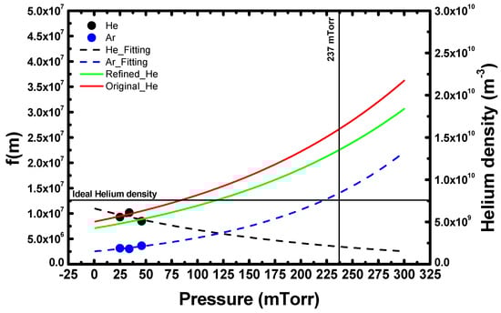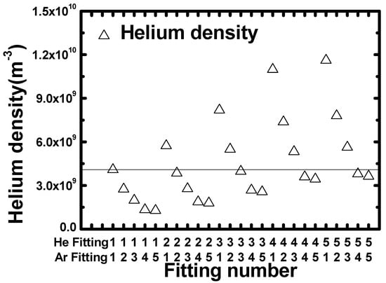 By substituting the fitting results in Table 1 and Table 2 for A and , respectively, in Equation (5), and the Ar density obtained by the ideal gas law in Section 2 for  in Equation (5), the He densities resulting from the different fitting ranges can be calculated. Figure 4 plots the calculated He densities from Equation (5). Note that  and  in Equation (5) each had five different values, as listed in Table 1 and Table 2, which resulted in a matrix multiplication of 25 total densities. As shown in Figure 4, He density increased as the fitting range for He was increased, while for Ar density decreased with an increase in fitting range. The average of the calculated He densities was , which is similar to the theoretical He density calculated from the ideal gas law. The He densities calculated from the same Ar and He ranges (i.e., 1-1, 2-2, 3-3, etc.) were closer to the average value. This phenomenon occurs because the rates of change of  and  are similar.