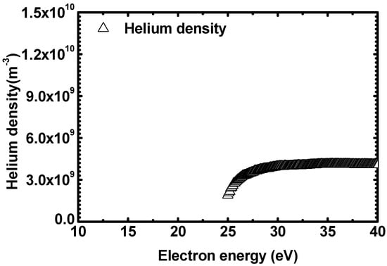 Figure 5 plots the He densities calculated with the refined APMS approach. As for the calculated densities, the signal appears beyond the electron energy of 24.7 eV (the threshold energy of He direct ionization) and it can be confirmed that it increases slightly as the energy increases, eventually saturating at around 27 eV. The initial value, which is the smallest one, appears to be approximately half of the saturated value. The measured He density can be obtained by averaging the densities in the region with the smallest change. Here, even if the result of the initial value with the largest error is included, there is no significant change in the average value because the region between the lowest point and the saturation point of He density is local compared to the saturation region. Therefore, He density from the refined APMS approach is obtained by averaging the entire electron energy area.