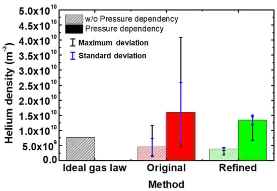In Figure 6, the He densities from each quantification method are shown. To check the maximum error, the maximum deviation was used. Therefore, the lower limits of the error bars were the minimum values in Figure 4 and Figure 5, while the upper limits were the maximum values of He density in Figure 4 and Figure 5. The density from the refined APMS method was , a value that was further from the theoretical He density from the ideal gas law () compared to the value from the original APMS method (). However, the original APMS results have both a larger maximum () and standard () deviation of He density due to fitting error compared to the refined APMS results with a smaller maximum () and standard () deviation. This demonstrates that the refined APMS approach provides more precise quantification results from QMS measurements than the original approach. Moreover, the accuracy of the refined APMS method can be further improved by considering the pressure dependence of . The black and blue circles in Figure 7 are the  values used at different pressures, where  and  were taken as averages. These values seem to be pressure-dependent, so the dashed lines in Figure 7 were obtained by fitting the circle values. Using the dashed lines, we obtained  and . Then the He density, which was re-calculated with  and , increased compared to before; the refined result, (1), was closer to the ideal result than that from the original approach (1.59). This is illustrated in Figure 6 with the solid plots. Therefore, the possibility of achieving higher accuracy with the refined APMS method exists.