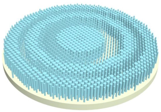 where is the phase profile, is the wavelength of incident light, is the distance from arbitrary unit cell on the metalens to the center of the metalens, and is the focal length [8]. As Equation (1) shows, the required phase profile varies with wavelength. If we design the sizes and spatial distributions of silicon nanopillars according to the phase profile at a certain wavelength, it may not satisfy the required phase profiles at other wavelengths. Moreover, it is difficult to find an adequate spatial distribution of silicon nanopillars with various cross-section sizes that simultaneously satisfies the required phase profiles at all wavelengths in the operating band.