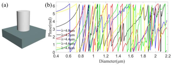 As mentioned above, metalens is a two-dimensional array composed of optical scattering structures with subwavelength feature sizes. The main function of a metalens is to control the wavefront of light according to the phase profile induced by the spatial distributions of scattering structures of various sizes. The schematic structure of the metalens is shown in Figure 1. The unit cell of the metalens, i.e., the optical scattering structure, is a silicon nanopillar on fused silica substrate, shown in Figure 2a. The height of the silicon nanopillar is fixed as 8.7 μm, and the diameters of the nanopillars vary from 0.4 to 2.2 μm, and the size of unit cell is 2.4 μm. The refractive indexes of silicon nanopillar and fused silica substrate in the mid-infrared are 3.84 and 1.38, respectively. The large refractive index of silicon nanopillar compared to its environment (air, water or oil) makes it possible to provide large phase manipulation and thus regulate light effectively. The phase shifts were calculated by finite-difference time-domain (FDTD) method using a commercial simulation software EastWave. The simulated phase shifts (folded between 0 and 2π) as functions of the nanopillar diameters at wavelengths of 4.0 μm, 4.2 μm, 4.4 μm, 4.6 μm and 4.8 μm are shown with different colors in Figure 2b, named as database in this work, clearly showing that both multiple 2π phase coverage and anomalous dispersions are achieved at these wavelengths, which provide more choices to find adequate silicon nanopillars in database to meet the phase requirements at different wavelengths, thus are crucial to the realization of broadband achromatic metalens. Here, anomalous dispersions mean that unfolded phase shifts do not always decrease or increase monotonically with nanopillar diameters, while phase shifts at some diameters experience a contrary variation tendency to most others.
