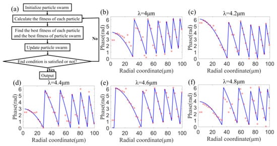 (a) Flowchart of PSO algorithm. (b–f) Comparisons between the corrected required phase profiles (blue line) and the phase profiles induced by the designed metalens (red point) at wavelengths of 4.0 μm (b), 4.2 μm (c), 4.4 μm (d), 4.6 μm (e) and 4.8 μm (f), as functions of the radial coordinate of the metalens.