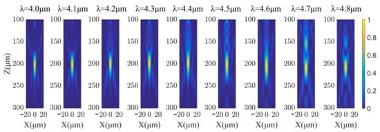 Simulated normalized intensity profiles of the normally incident light transmitted through the metalens in the xz-plane at wavelengths from 4.0 μm to 4.8 μm (spaced by 0.1 μm), where z-axis is the optical axis and x-axis is the radial direction of the metalens.